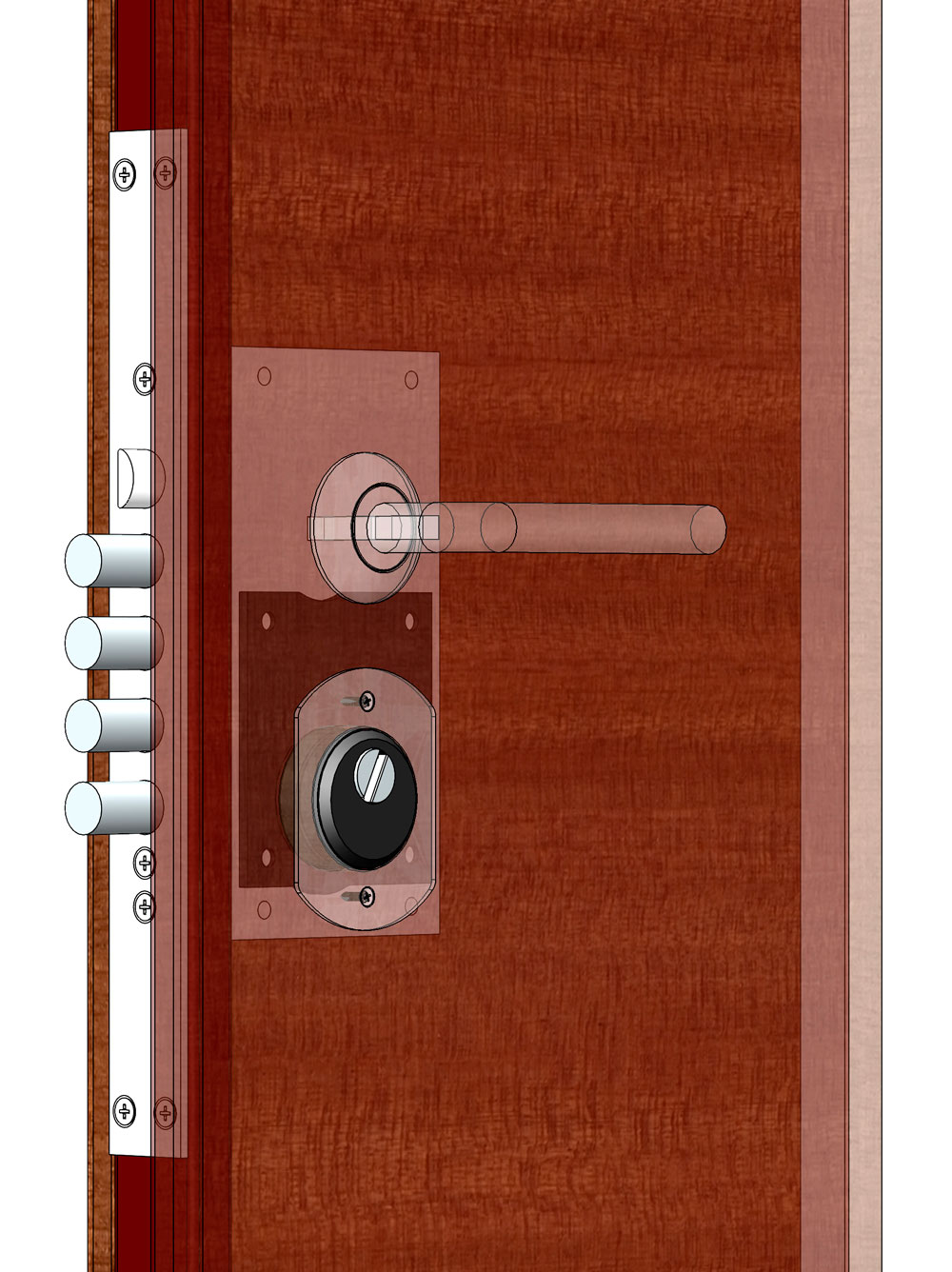 Компактные габариты бронепакета в большинстве случаев позволяют завести его в дверь без разборки самого бронепакета, через вырез под замок в торце полотна. В некоторых случаях (тонкий корпус замка, большая толщина декоративной панели двери и т.п) установщику придется разобрать бронепакет, завести отдельно бронепластину и стянуть броненакладку с бронепластиной в двери, через отверстие под цилиндр.