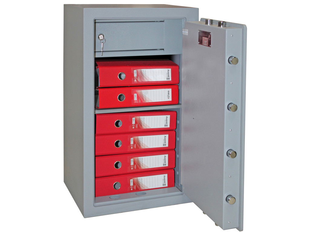 Габариты сейфа позволяют свободно разместить документы формата А4 в папках Korona, горизонтально и вертикально. Сейф имеет два отверстия под анкерные крепления, снизу и сзади, диаметром 10 мм. В комплект входит один анкер.