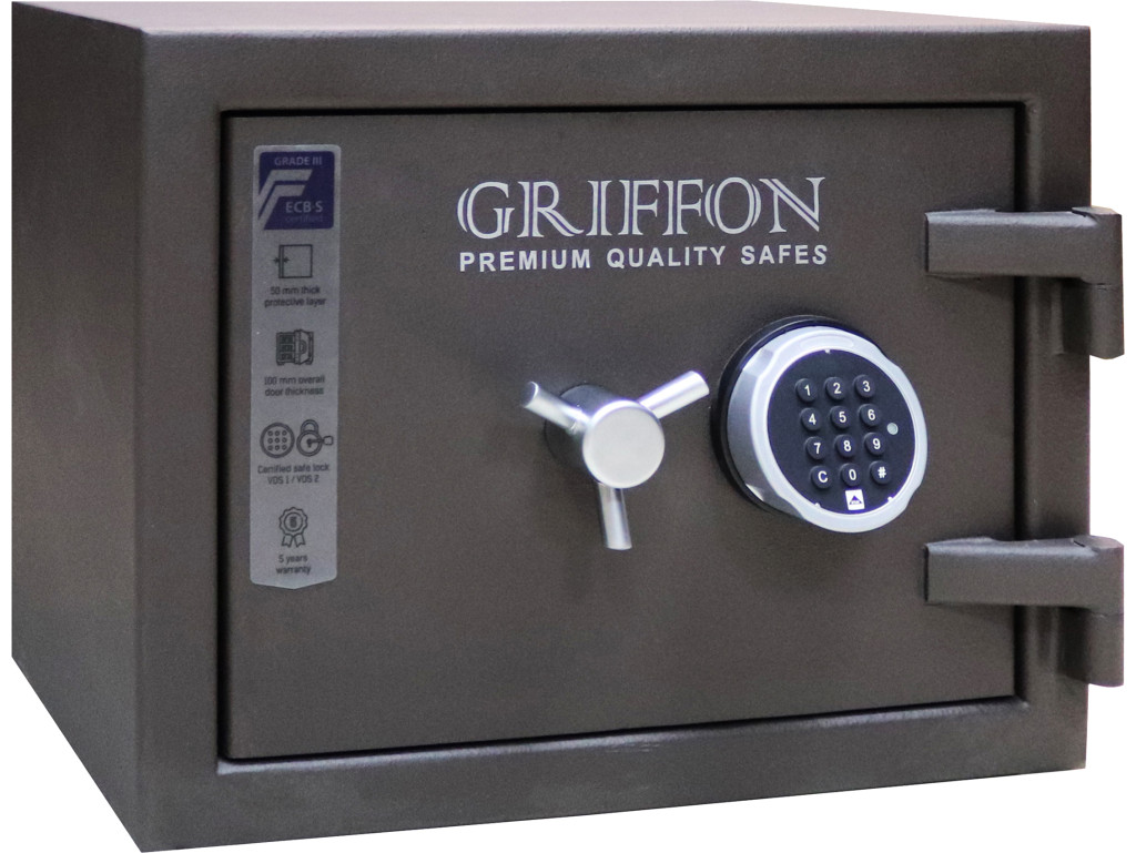 Сейфы CLE III торговой марки GRIFFON сертифицированы в Германии Европейским органом сертификации ECB-S и соответствуют III классу взломостойкости по EN 1143-1. Они также имеют украинский сертификат огнестойкости и соответствуют LFS 30P (30 минут) по ДСТУ EN 15659.