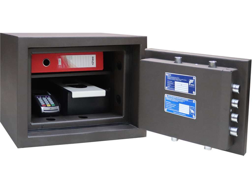 Конструктивно сейф представляет собой двустенную конструкцию, заполненную 50-миллиметровым слоем армированного фортификационного бетона. Наружный лист выполнен из 2-миллиметровой стали, внутренний — 6-миллиметровая нержавеющая сталь. Замковый отсек оснащен ригельной системой запирания, управляемой ручкой и блокируемой электронно-кодовым замком STUV SWINGLOX (Германия, сертификат класса VDS 2). Ригели Ø25 мм, вращающиеся, трехстороннего запирания (4+2+2). Дополнительно установлена блокировка от выбивания замка, защита ригелей и замка от высверливания.