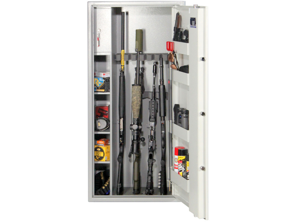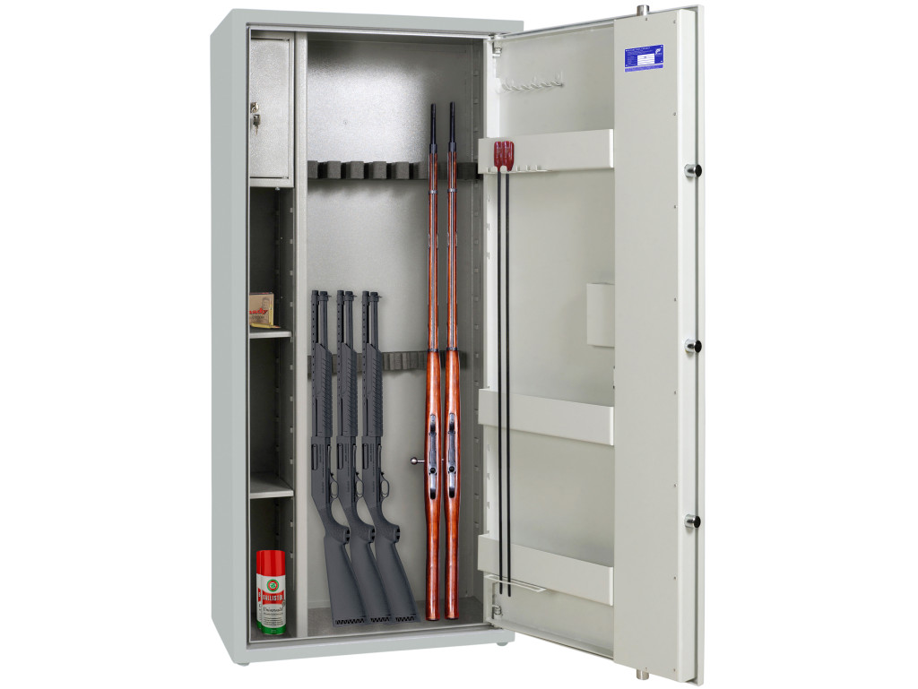 Эта серия отличается добротным исполнением (гнутая сталь толщиной 3 мм), грамотными конструктивными решениями (единый противоотжимный паз по всему притвору двери), полноценной ригельной системой запирания, управляемой ручкой и блокируемой замками европейских брендов. В сейфах этой серии реализована масса удобных решений, от возможности перемещения держателей оружия и полок (в моделях с полками), до отсека в двери, где расположены карманы и держатели шомполов.