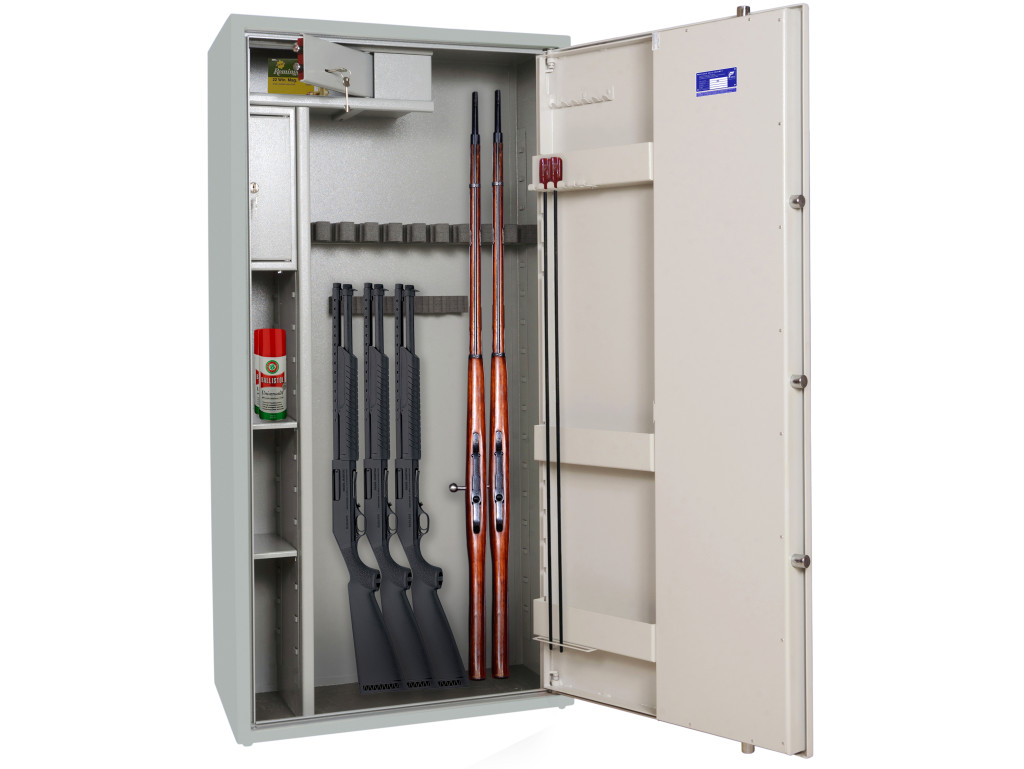 Эта серия отличается добротным исполнением (гнутая сталь толщиной 3 мм), грамотными конструктивными решениями (единый противоотжимный паз по всему притвору двери), полноценной ригельной системой запирания, управляемой ручкой и блокируемой замками европейских брендов. В сейфах этой серии реализована масса удобных решений, от возможности перемещения держателей оружия и полок (в моделях с полками), до отсека в двери, где расположены карманы и держатели шомполов.